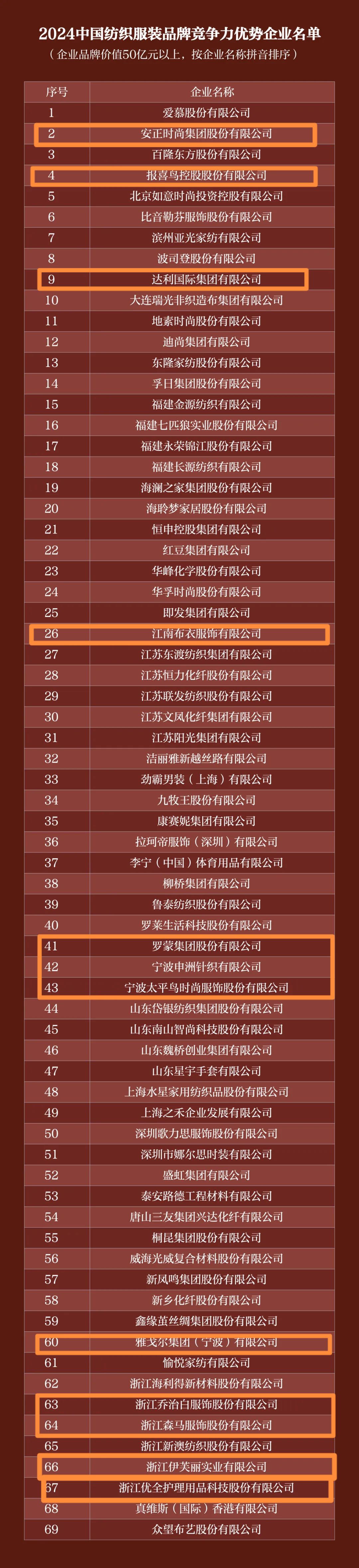 据介绍,基于相关国际标准、国家标准,优化建立模型体系,通过系统评估,69家企业品牌价值超过50亿元以上,确定为“2024中国纺织服装品牌竞争力优势企业”。中国纺织工业联合会将持续深化品牌培育与竞争力评价提升工作,紧密结合新时代品牌发展趋势与需求,研究出具品牌竞争力评价提升报告与品牌价值证书,配套开展更具指导意义与实际推动价值的品牌培育系列工作。