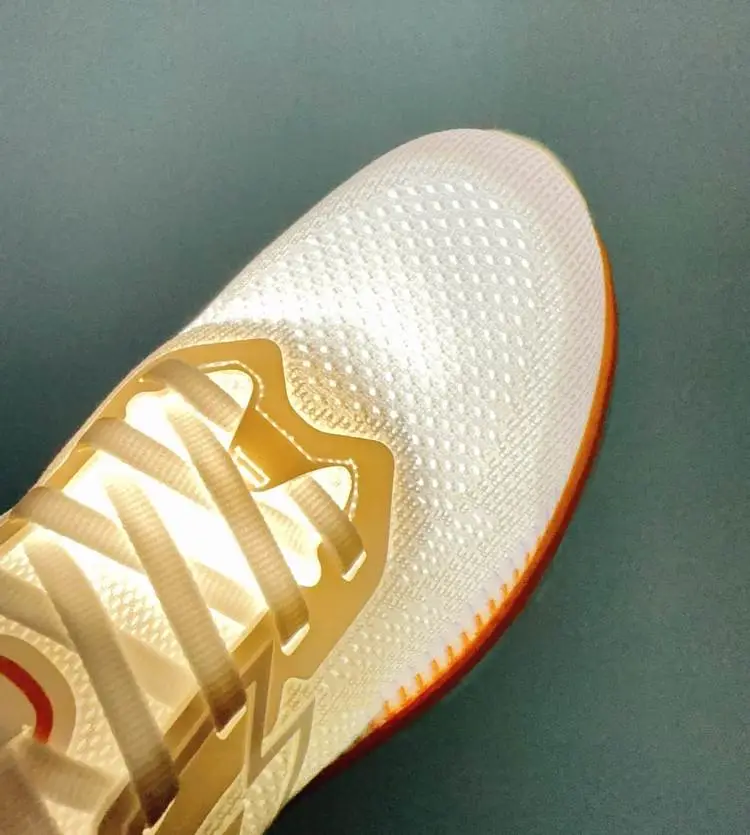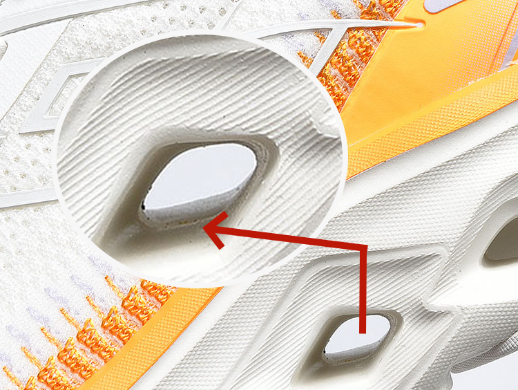 这双鞋鞋面4D梦幻纱,织法用了“苏绣”工艺,可以瞬间加大透气网孔的大小,薄而不透,较快速散热不闷脚。
