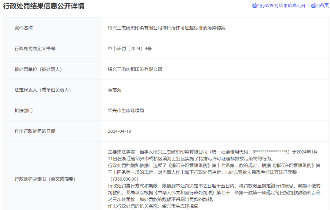 绍兴三杰纺织印染有效公司持排污许可证超标排放污染物案