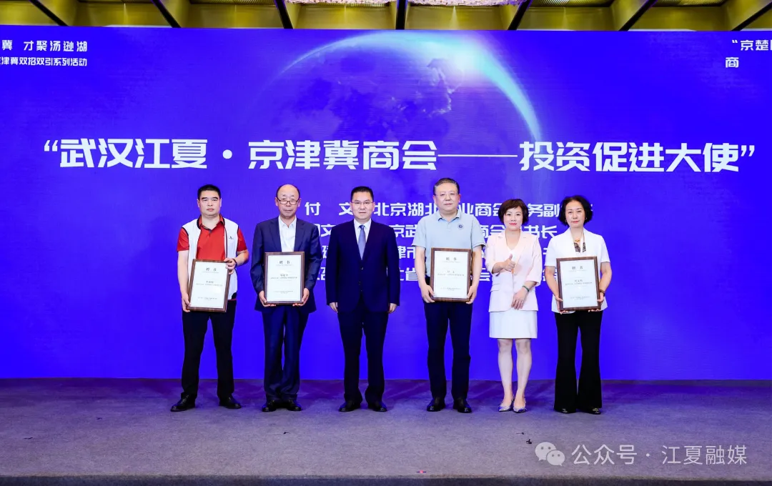 5月19日,武汉江夏·京津冀双招双引系列活动之“京楚同心 共商发展”商会专场活动在京举办。现场签订了“江夏·京津冀商会——投资促进工作处”合作协议,并为4名“武汉江夏·京津冀商会——投资促进大使”颁发聘书。武汉市工商联副主席刘冬,江夏区委常委、区委办公室主任罗尚国,副区长梁爽出席活动。