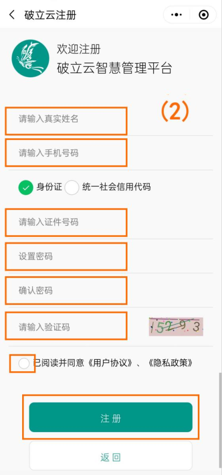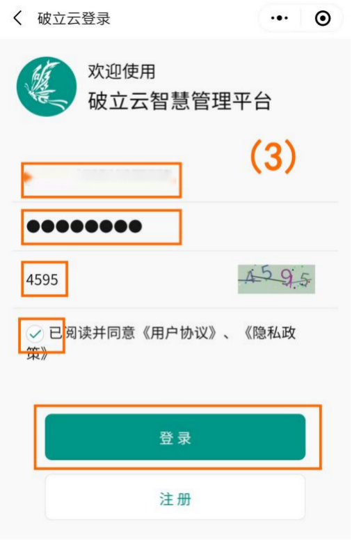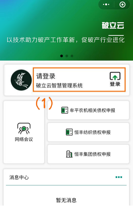 1、扫码进入破立云智慧管理系统(如图序号(1)),点击“请登录”(如下图);