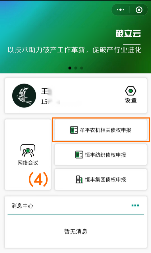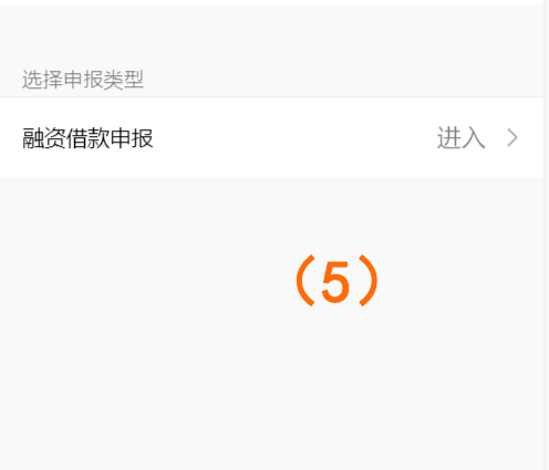 3、登录成功后,点击“牟平农机相关债权申报”,(如图序号(4))进入选择申报类型界面(如图序号(5))。