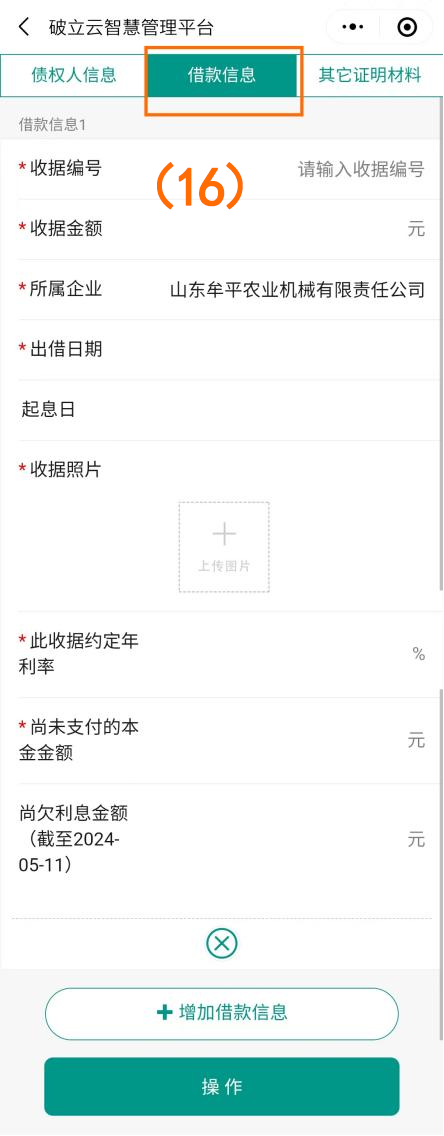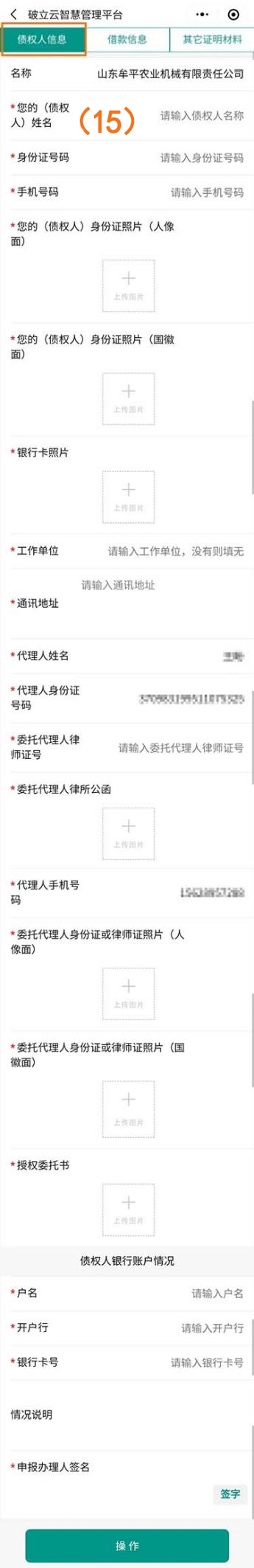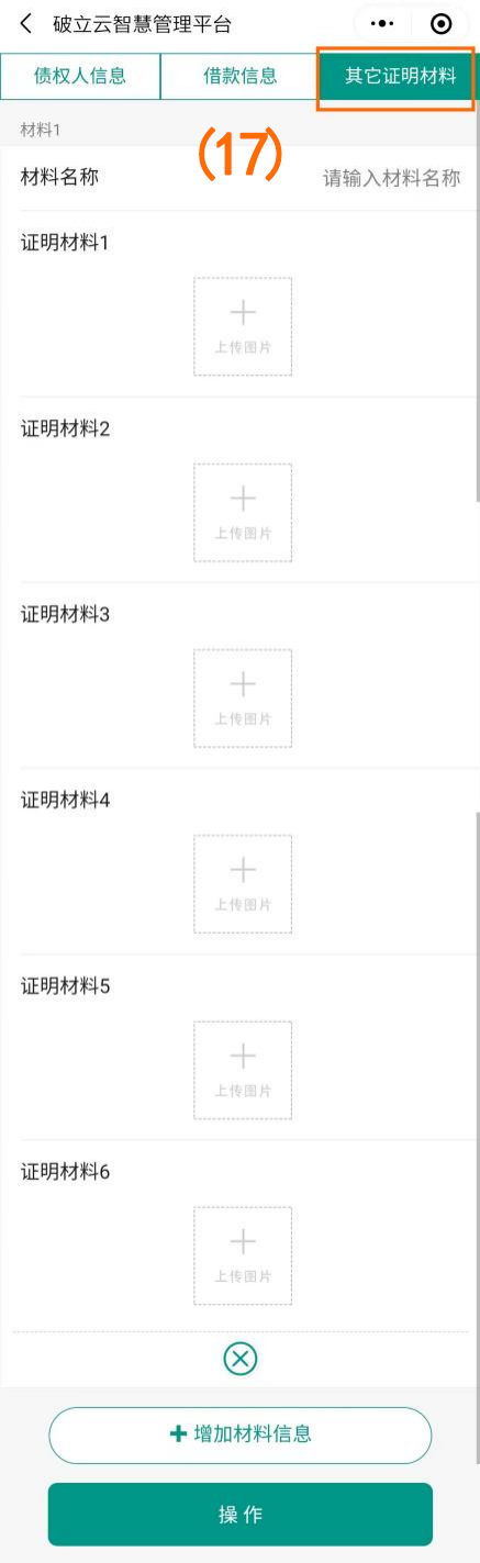 点击下一步填写“债权人信息”、“借款信息”、“其他证明材料”(如图序号(15)(16)(17)),填写完成后点击下方操作按钮进行提交。