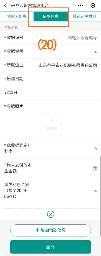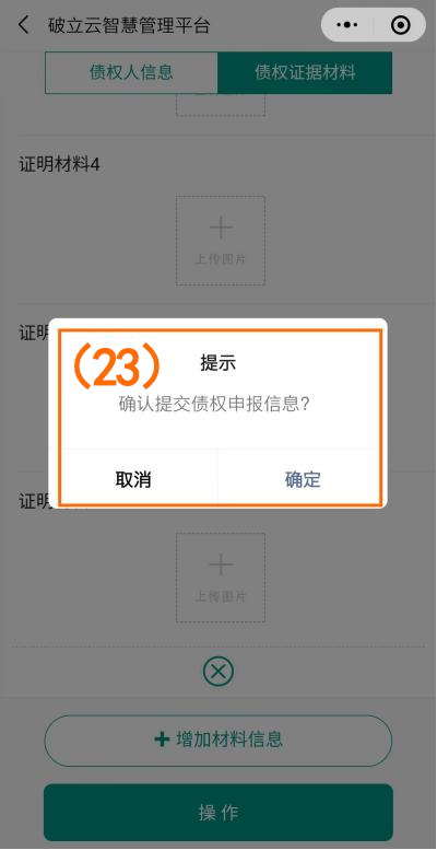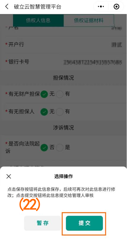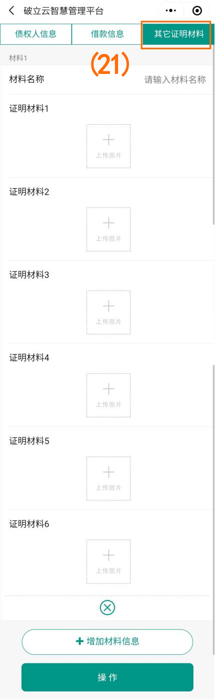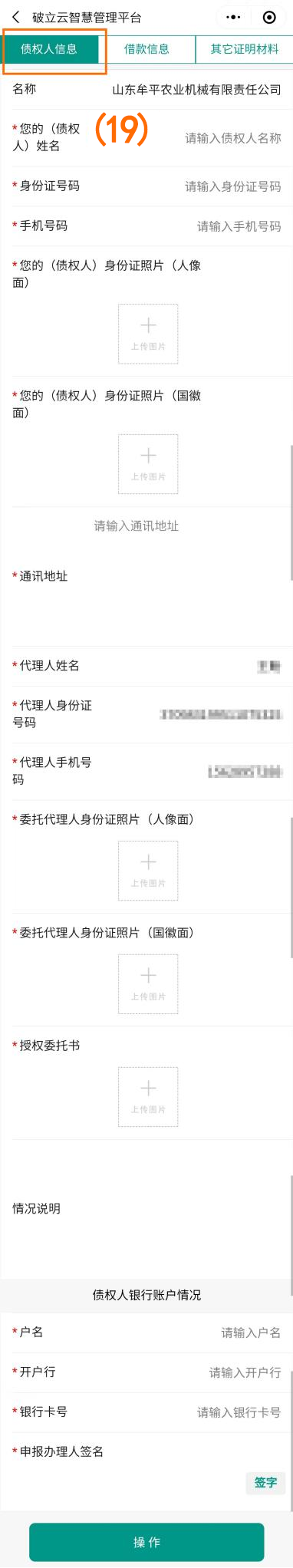 点击下一步填写“债权人信息”、“借款信息”、“其他证明材料”(如图序号(19)(20)(21)),填写完成后点击下方操作按钮进行提交。