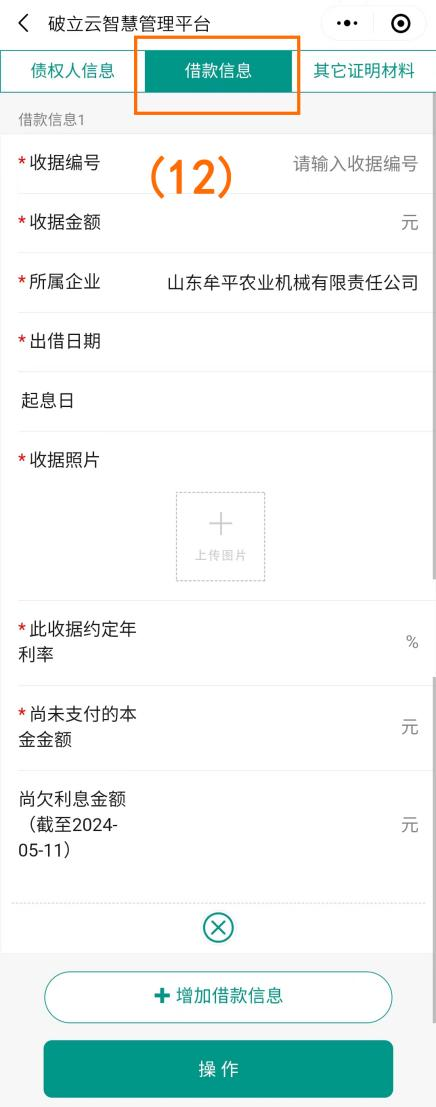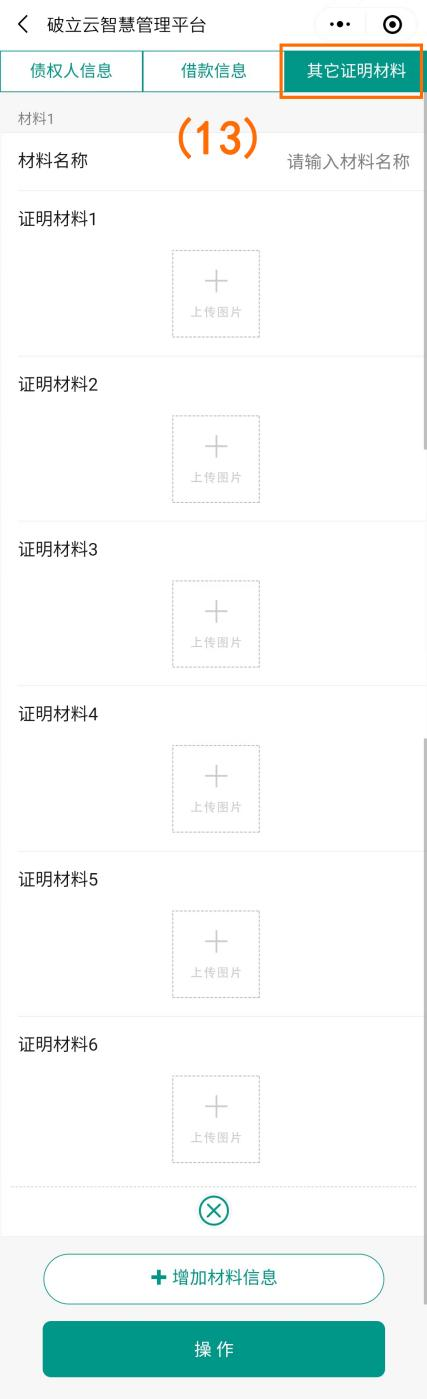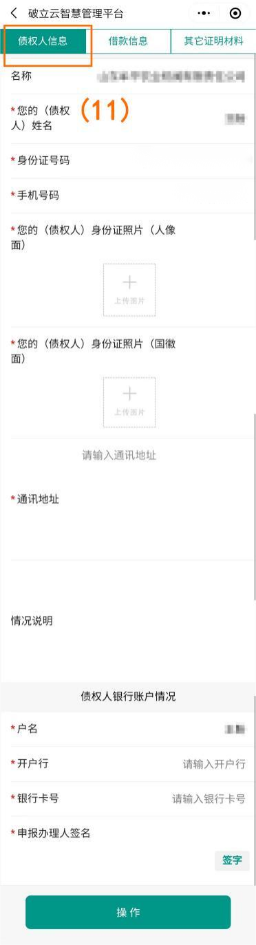 点击下一步填写“债权人信息”、“借款信息”、“其他证明材料”(如图序号(11)(12)(13)),填写完成后点击下方操作按钮进行提交。