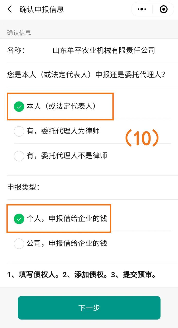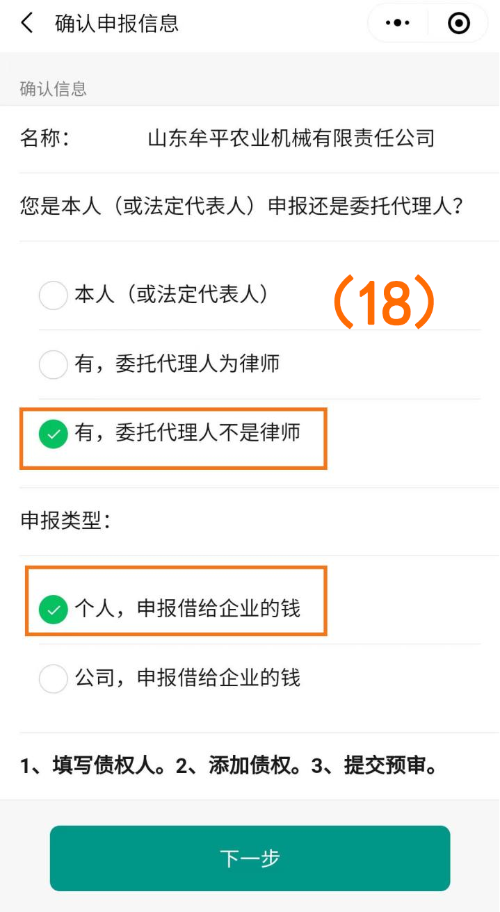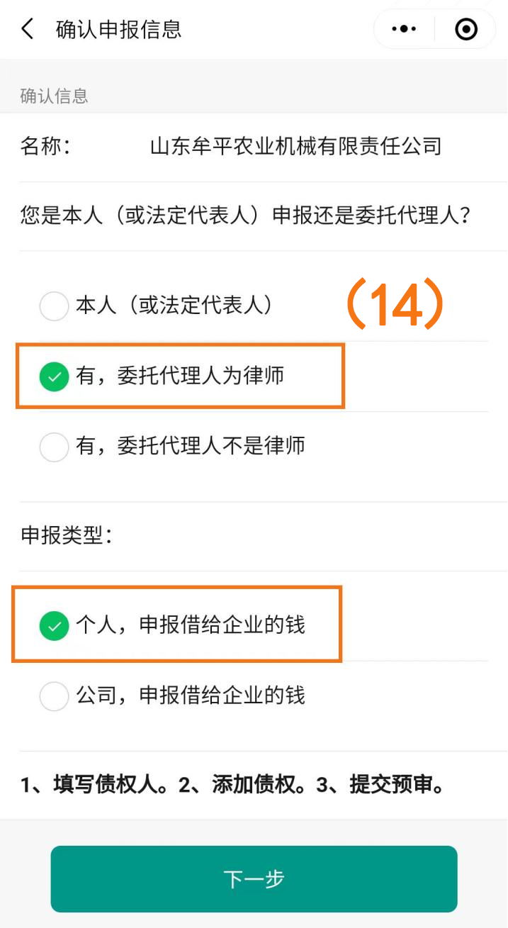 第二种情况:“有,委托代理人为律师”+“个人,申报借给企业的钱”(如图序号(14));