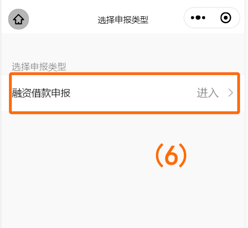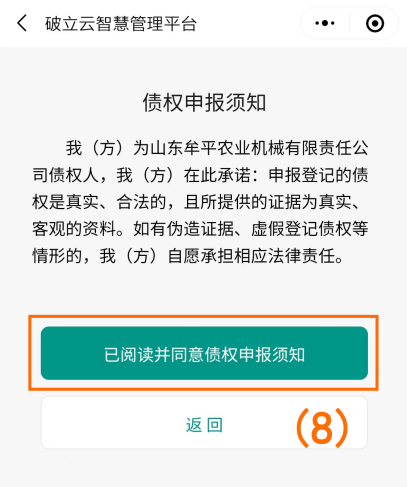 4、选择申报类型“融资借款申报”(如图序号(6))点击进入新增页面(如图序号(7)),阅读债权申报须知并确认(如图序号(8))。