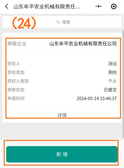 7、当申报债权全部填写完成后,点击下方“操作”选择提交按钮将此信息提交给管理人审核并确认提交债权申报信息;(如图序号(22)(23)),如您申请其它类型债权或代理其他人债权,可点击“新增”按钮,继续提报(如图序号(24)。