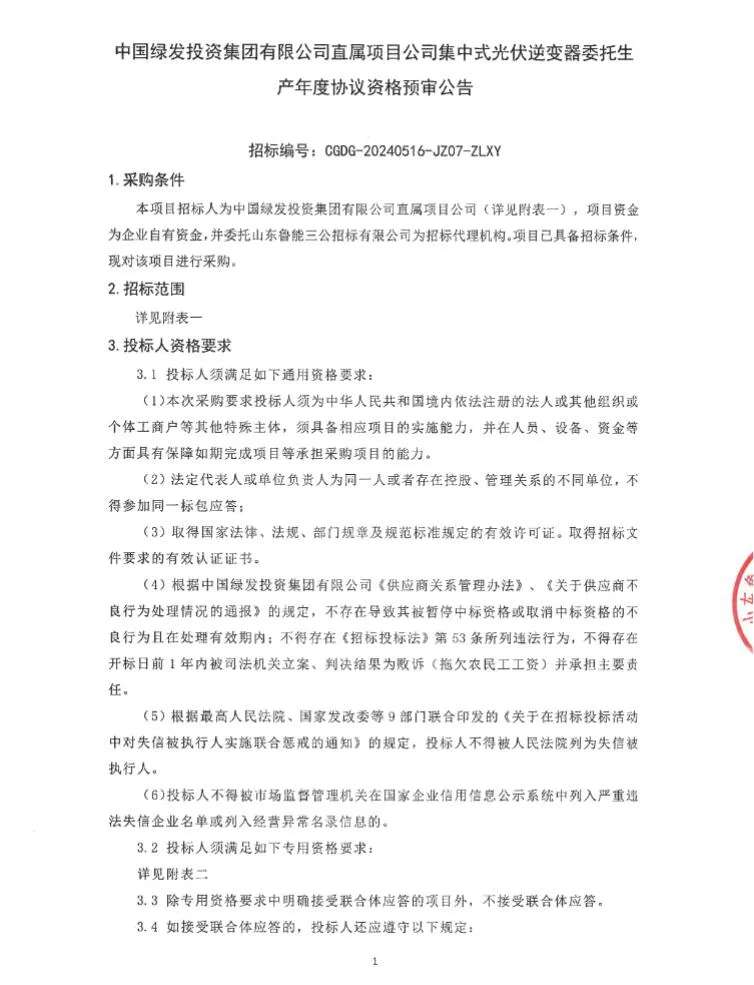 5月16日,中国绿发投资集团有限公司直属项目公司集中式光伏逆变器委托生产年度协议资格预审公告发布。