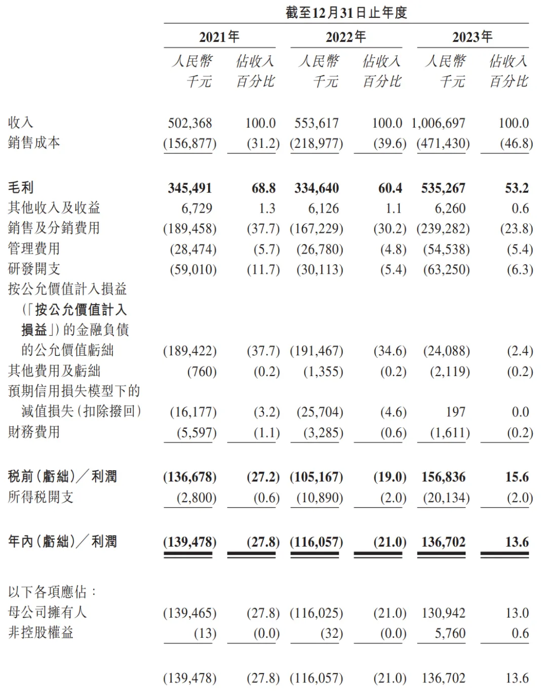 趣致集团2020年、2021年、2022年期内利润分别为-1.39亿、-1.16亿元、1.37亿元;期内亏损率分别为-27.8%、-21%、13.6%。