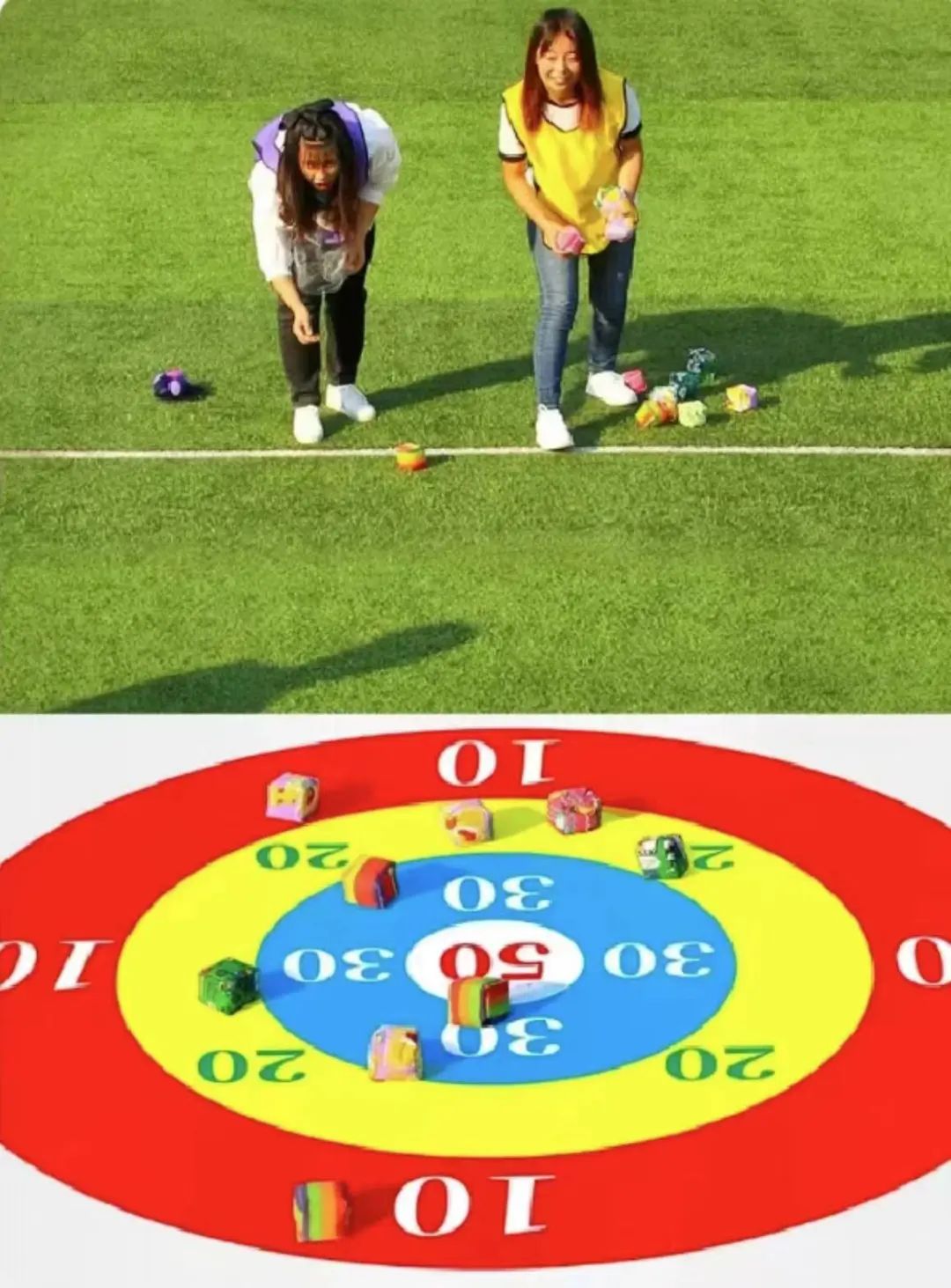 参与成员一人1次机会,往一个标有分数区域的大海报(或用粉笔在地上画出区域)上扔沙包(若沙包停在两个分数区域之间,则按照超过沙包50%体积一边的分数计算)。(每组最多参加该游戏两次)