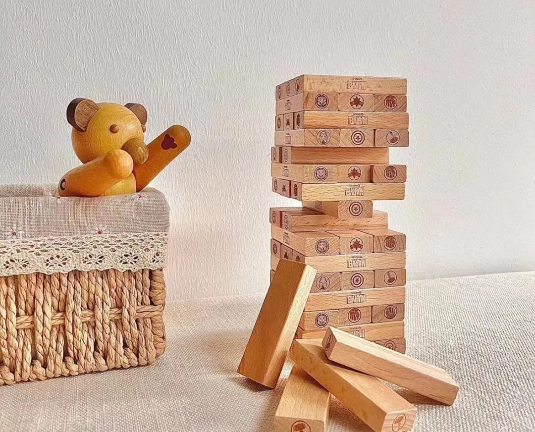 参与成员依次在交叉堆放的一堆积木塔中抽取积木块,并确保积木塔不会倒塌,当积木搭倒塌时,统计该小组抽出的积木总数。(每组最多参加该游戏两次)