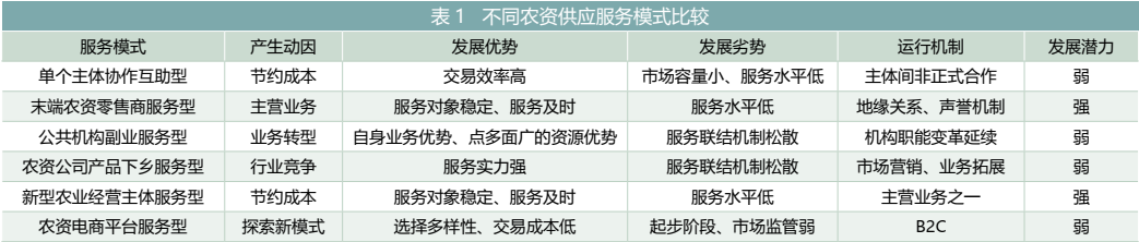 从发展优劣势来看,单个主体协作互助型虽然交易效率高,但是市场容量较小,服务内容单一且服务联结机制松散,主体间的非正式合作导致其稳定性相对较差,极易受到外生冲击,发展潜力最弱;末端农资零售商服务型和新型农业经营主体服务型均具备服务对象稳定且服务及时的优势,但是服务水平相对偏低;公共机构副业服务型得益于自身业务优势和点多面广的资源优势,能够有效提高市场占有率,但是服务联结机制松散;与公共机构副业服务型一样,农资公司产品下乡服务型也存在服务联结机制松散的劣势,但其拥有产业链上游的专业技术优势,服务实力较强,需要通过服务模式创新更好地发挥服务实力优势;农资电商平台服务型最大的优势在于选择多样性,且交易成本低,但是农资产品的特殊性决定了其质量监管的脆弱性,交易的技术属性与消费群体的知识有限性也决定了其处于发展的起步阶段。