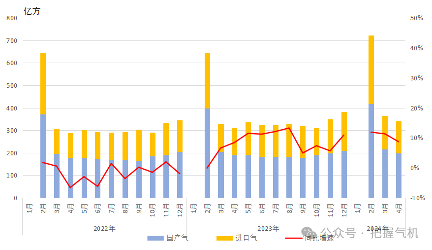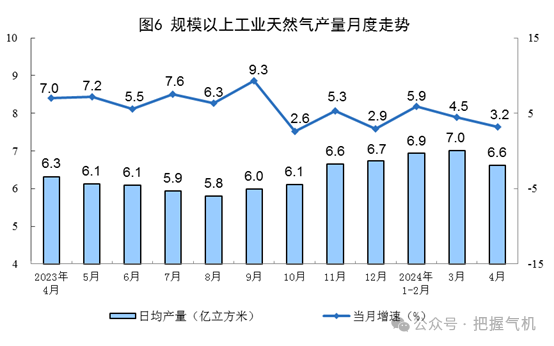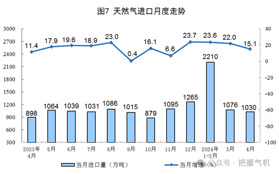 1—4月份,规上工业天然气产量830亿立方米,同比增长5.0%。进口天然气4300万吨,同比增长20.7%。