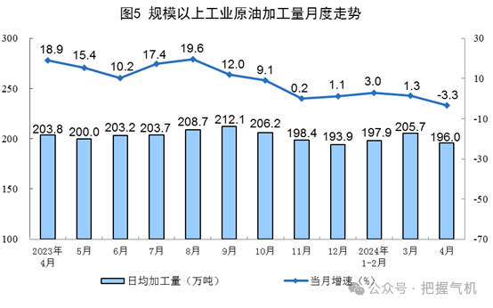原油加工有所下降。4月份,规上工业原油加工量5879万吨,同比下降3.3%,3月份为增长1.3%;日均加工196.0万吨。1—4月份,规上工业原油加工量24126万吨,同比增长1.1%。