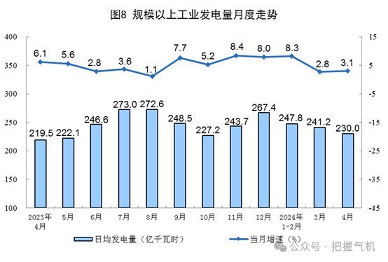 电力生产增速有所加快。4月份,规上工业发电量6901亿千瓦时,同比增长3.1%,增速比3月份加快0.3个百分点;日均发电230.0亿千瓦时。1—4月份,规上工业发电量29329亿千瓦时,同比增长6.1%。