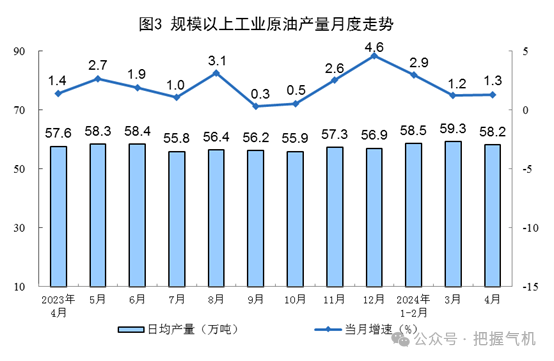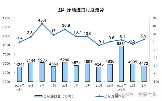 1—4月份,规上工业原油产量7095万吨,同比增长2.1%。进口原油18207万吨,同比增长2.0%。