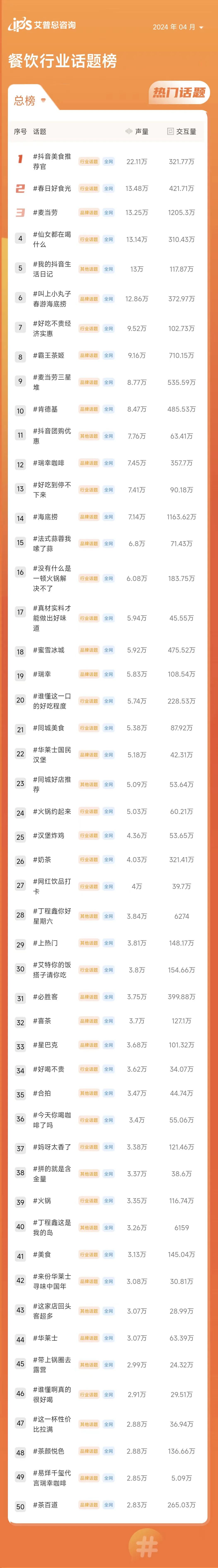 4月餐饮行业排名前三的热门话题为:#抖音美食推荐官(行业话题,声量22.11万,交互量321.77万)、#春日好食光(行业话题,声量13.48万,交互量421.72万)、#麦当劳(品牌话题,声量13.25万,交互量1205.30万)。