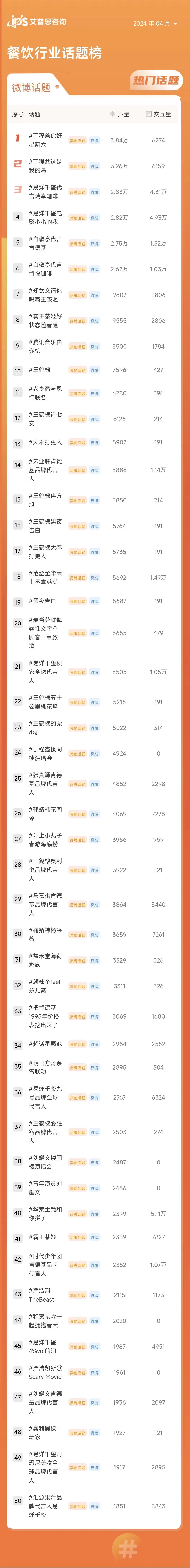 餐饮行业排名前50的热门话题中,包括品牌话题19个、行业话题20个、其他话题11个。
