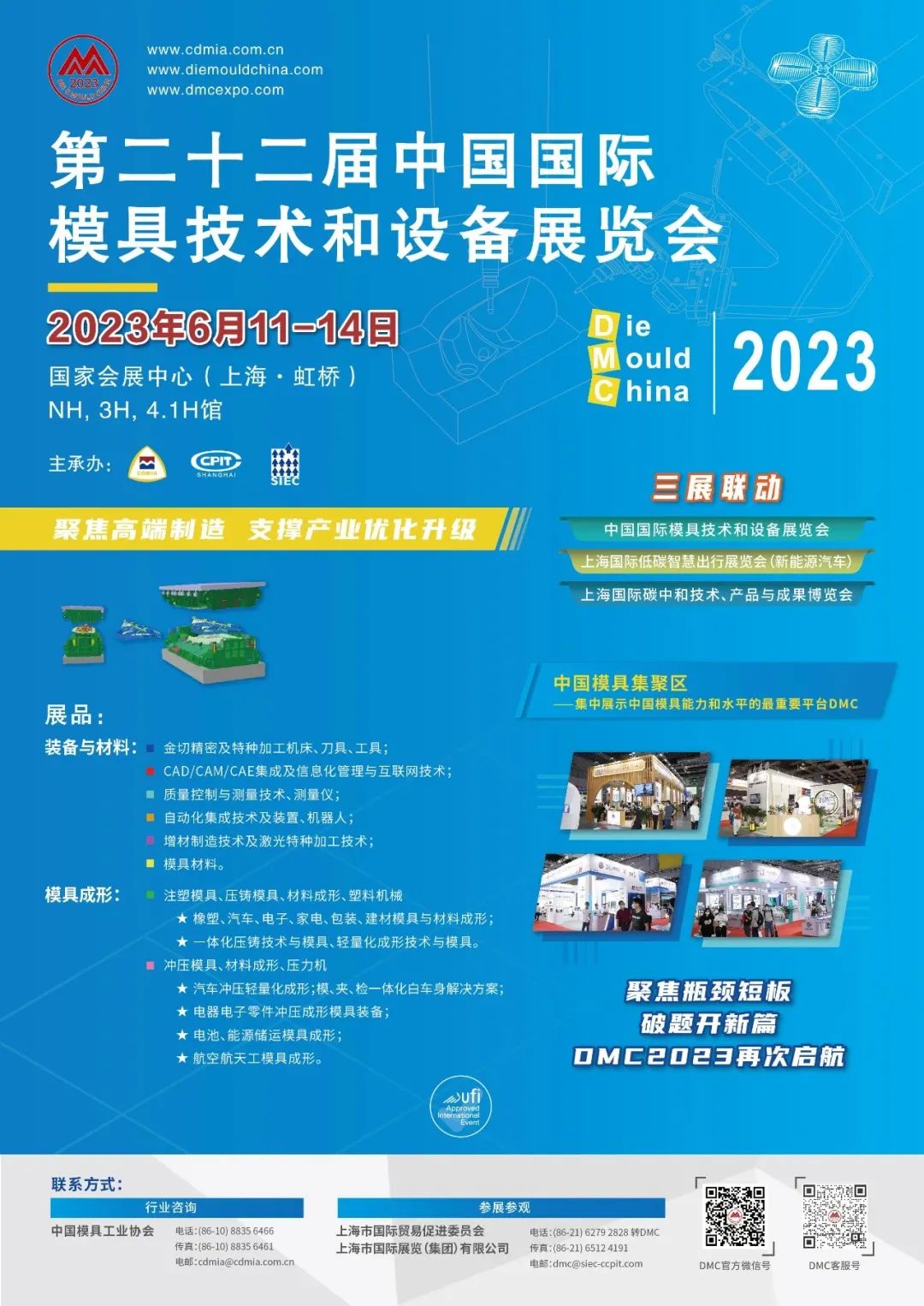 一年一度模具届盛大聚会——第二十二届中国国际模具技术和设备展览会(DMC2023)将于2023.6.11-14在国家会展中心(上海·虹桥)隆重举办!