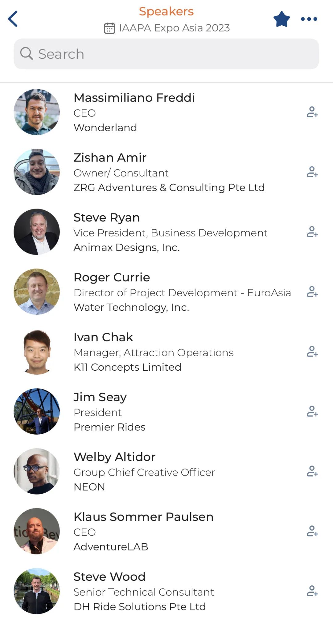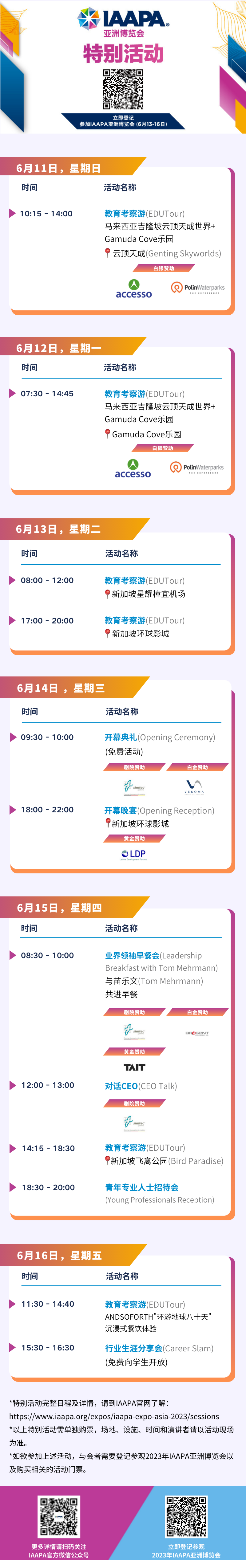 IAAPA博览会特色之「特别活动」,邀您在「开幕晚宴」与数百位行业同仁“包场”新加坡环球影城,与行业领袖 - 苗乐文(Tom Mehrmann) 共进早餐,在「对话CEO」与IAAPA历届主席与行业名人堂对话,在「青年专业人士招待会」认识更多行业才俊,通过「行业生涯分享会」了解游乐景点业的职业前景。