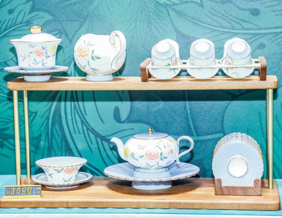 国瓷永丰源市场运营事业部总经理肖文科指着他们今年新推的瓷器“月亮时光”介绍,这套产品打眼看过去,既有中国传统的感觉,又有西式英伦的味道。