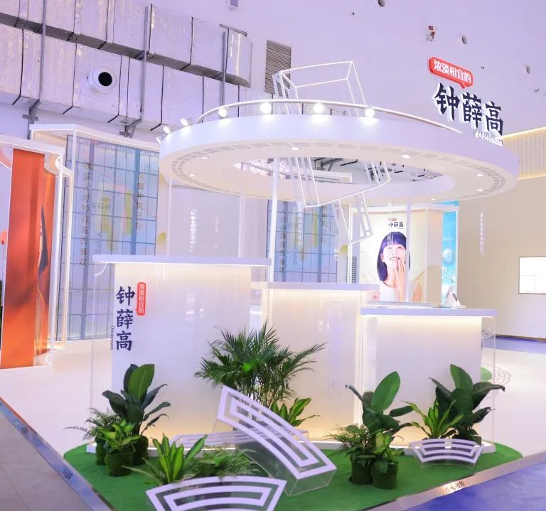 钟薛高展台以“浓淡相宜的钟薛高”为主题,整个展台采用钟薛高标志性瓦片雪糕和回型纹元素,凸显品牌特色,打造摩登写意的“新中式”展位空间,明亮简洁的白色灯光,辅以朝气蓬勃的绿植点缀,力图打造出贴合年轻人审美、吸引参观者打卡的展台,并诠释崇尚健康、自然的品牌理念。