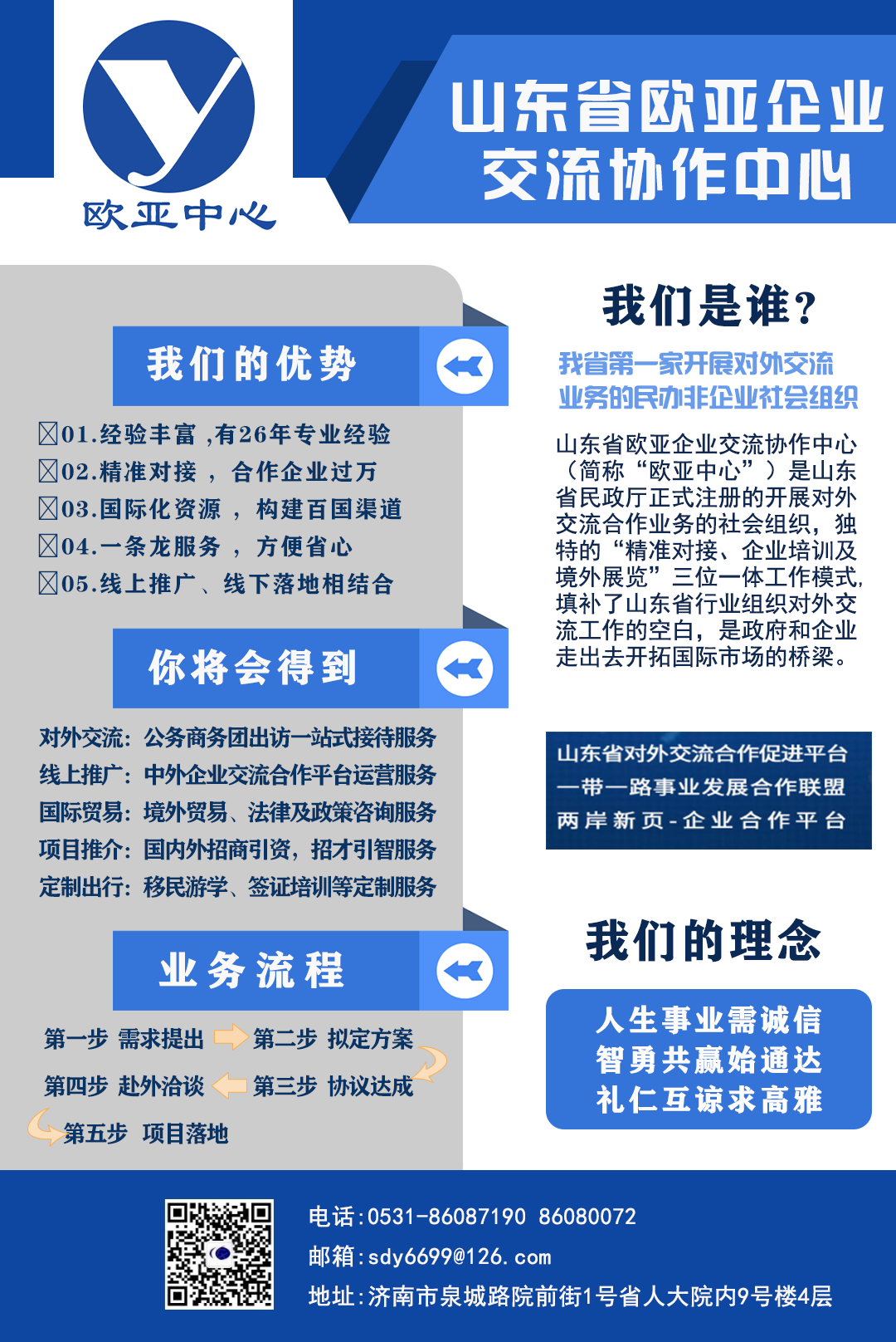 山东省欧亚企业交流协作中心作为开展对外交流与合作的重要平台,将继续致力于国内、国际产能合作,专业培训,精准对接,助推行业、企业“走出去”,并将继续为省内企业提供境内外展览展示,人才与技术培训、境外项目推荐分析、前期对接、出访实地考察洽谈、国际贸易和投资、政策支持、人才引进、法律咨询、融资并购、通关物流、手续办理等全方位的咨询和服务。