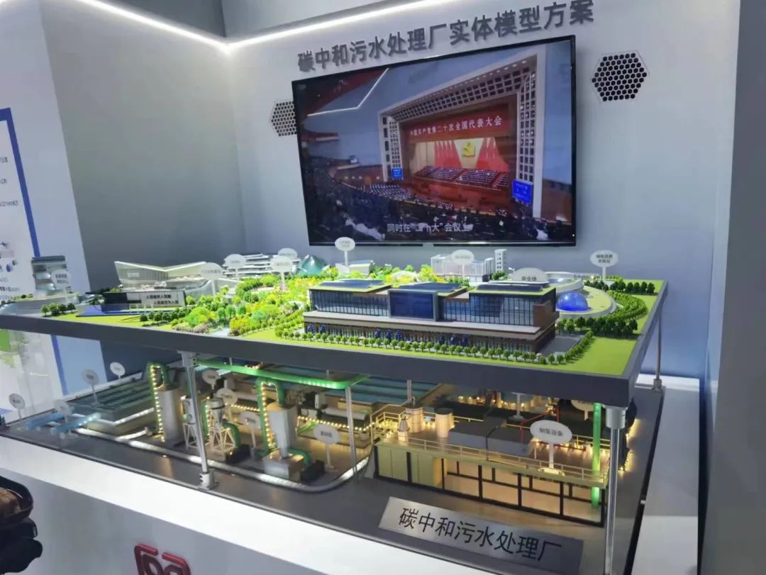 在另一边,上海城投集团带来的碳中和污水处理厂模型也颇具亮点。模型地上部分集合了公园、剧场、图书馆、游乐园、消防站等设施,而这个“未来污水厂”藏在了地下。工作人员介绍,污水厂位于上海市宝山区,将集成水源热泵、污泥页岩发酵制氢、电解水产氢、高层水力发电等多种技术,对污水及其中的污染物资源进行最大化地回收、利用,并用来反哺周边的社区。