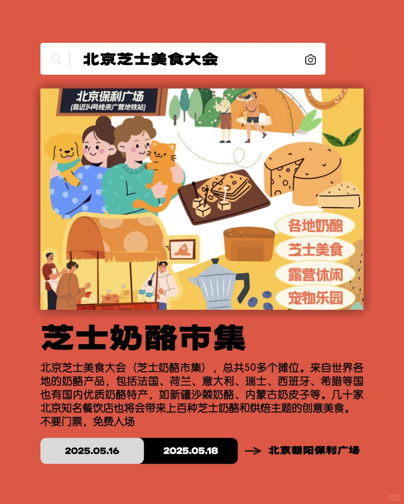 ?@搭子一起周末一起逛起来啊!!!\n \n1️⃣北京芝士美食大会\n2️⃣喘口气市集\n3️⃣北京巨C汉堡节\n4️⃣SKP-S「精酿啤酒季」\n5️⃣香氛市集\n6️⃣世界博物馆日\n7️⃣北京威士忌节\n8️⃣北京当代·艺术博览会\n9️⃣北京手帐集市\n?北京世纪家博会\n.\n