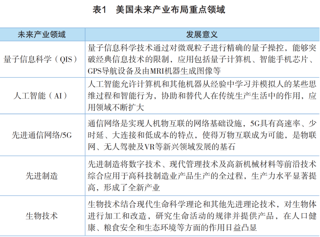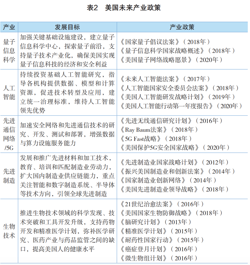 OSTP指出,美国将统筹协调政府各个部门,由联邦政府、企业、院校和科研机构共同参与,加大对新兴技术群投入,从基础研究和发展、劳动力发展、宽松监管和国际参与四个方面布局美国未来产业。如表2所示,近几年美国通过发布各项发展战略、行动计划、政策指引等功能性产业政策,指导科研投入、人才吸引、基础设施建设等环节,引导创新资源聚集,营造了有利于未来产业发展的政策环境,使美国未来产业核心竞争力不断增强。