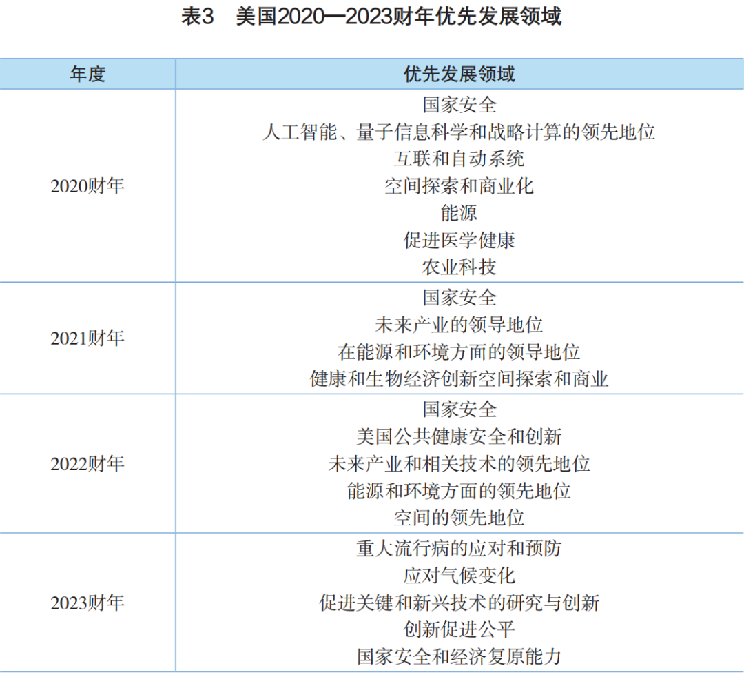 美国在2020—2023财年研发预算优先领域备忘录中,均明确表示将人工智能、量子信息科学等未来产业作为国家科技发展的优先领域(见表3)。拜登竞选时表示,将在四年内提供3000亿美元的联邦研发资金,大力促进美国先进材料、生物技术等科技产业发展。2021年美国众议院科学委员会在提出的《NSF未来法案》中计划向未来产业领域投入726亿美元。美国国会发布《无尽前沿法案》,计划五年之内投放1100亿美元,支持量子信息科学、人工智能等新兴技术群基础和应用研究、商业化、教育培训等项目。