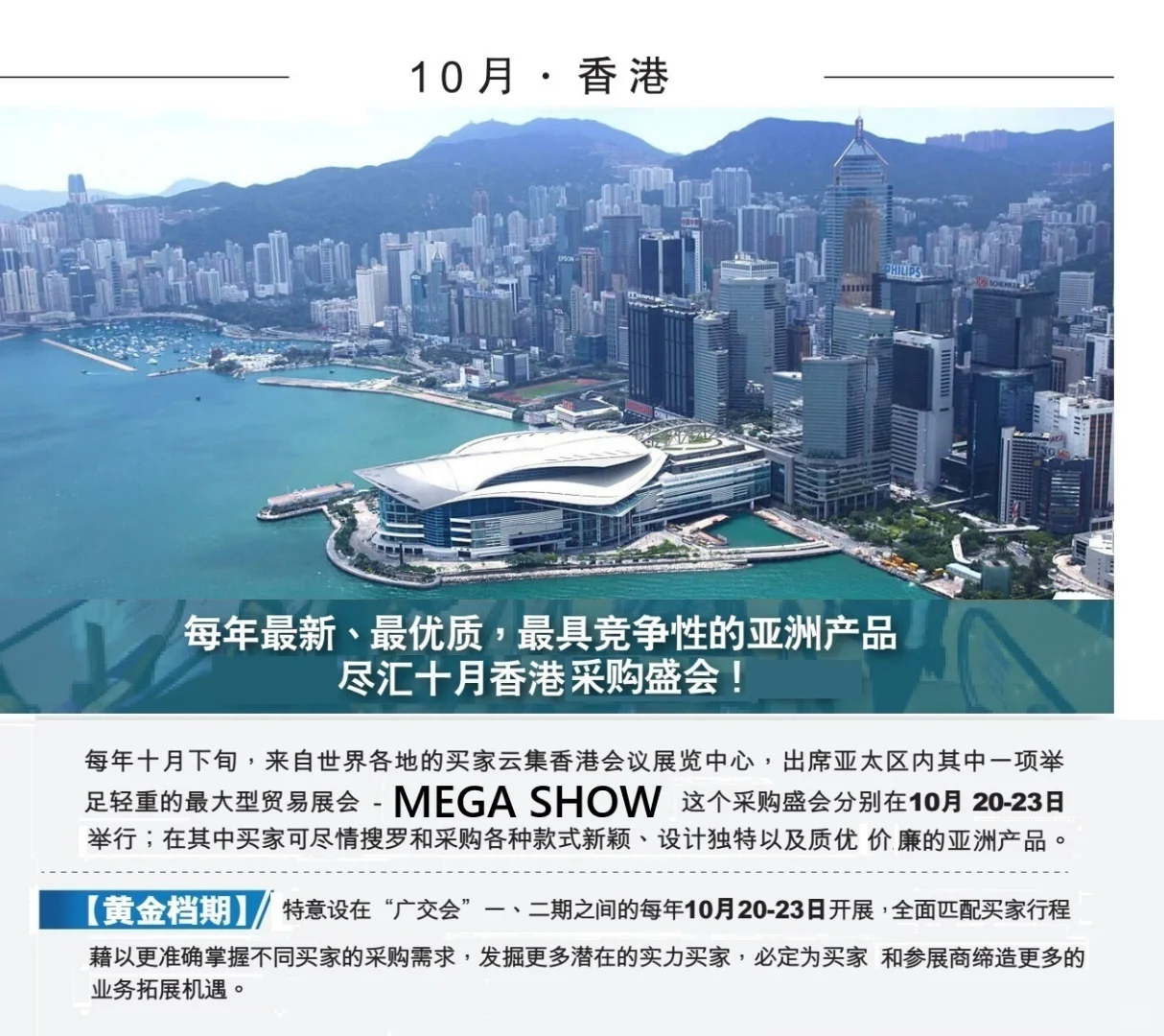你为何要参观?\n1.每年秋季香港最大型亚洲产品展\nMEGA SHOW Series乃香港每年秋季最大型的亚洲产品采购盛会,绝对是你搜购亚洲新品和物色优质供应商的必然之选。\n2.亚洲最新优品荟萃\n亚洲制造的产品素以设计新颖精巧和质优价廉见称,广受环球买家欢迎和追捧;MEGA SHOW展会给你展示最新及至精彩热卖的亚洲产品,以及来自亚洲的优质制造商和供应商。\n3.黄金档期\n展会的举行日期正好配合买家秋季采购高峰期,成为环球买家每年到亚洲和华南地区作巡回采购行程其中必到的一站。\n4.尽享一站式采购\n展会汇聚大量高利润新品,助你发展业务并走在市场的前面。你将在MEGA SHOW展会中搜寻到林林总总的亚洲产品,当中更有不少产品是你从未见过,在本展会首次发布的新品。\n5.一展尽揽大量目标参展商\n2024年展会将再度汇聚多家优质参展商,由老牌礼品供应商到初创企业和新参展商,向你呈献他们最新及至人气热卖的亚洲产品。#国际展会 #展会 #会展 #香港展 #礼品展 #品牌出海 #外贸分享 #欧美市场 #外贸人 #megashow #展会现场