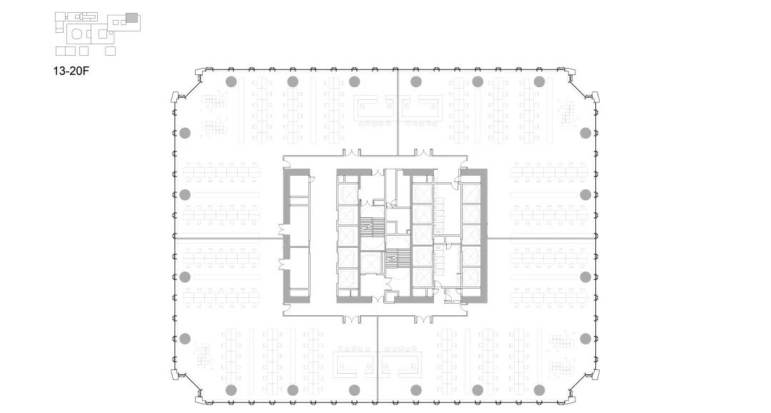 “树冠层” 位于巨大的平台之上, 150米至250米不等的七栋塔楼仿佛从伞盖层中破土而出。塔楼分布在平台四周,提供了相对私密的办公环境,可以俯瞰“中央公园”——漂浮大板上葱郁的绿色景观。所有塔楼都通过水平方向的连接体系与中央平台充分融合,以促进企业间的信息交换和互动交流。