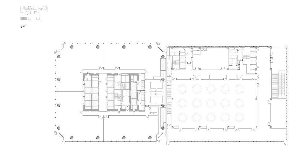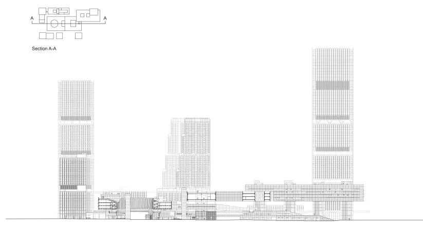 “伞盖层”由一个长400米,宽110米的巨大平台构成。企业可以在此成长、学习、彼此受益,是一个理想的“产业孵化器”。这里拥有实验研究、联合办公、对话交流、非正式会谈、研讨会、商品展会及体育活动等空间,是中小型企业迅速发展的理想沃土。平台和四周的塔楼良好连接,拥有便利的可达性,活力四射、共存相生、欣欣向荣的企业工作环境。