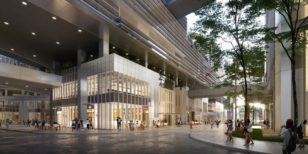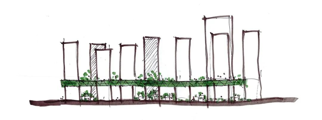 这个活力空间被提升,把地面街区还给城市,减少对公共空间的侵占。平台下方形成一个充满活力且受蔽护的商业区,通过优化立体垂直交通,汇聚不同楼层的人群,通过塑造绿色休闲空间打造人性化的尺度,为较低楼层提供更佳的自然光照条件。