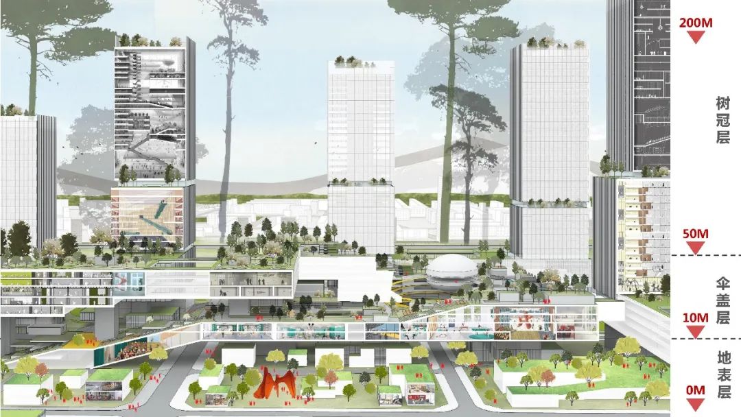 深圳南山科技创新中心设计以“产业生态雨林”为概念,希望建造一个拥有持续吸引力的复合型产业空间。本项目通过被城市公园连接的“地表层”、“伞盖层”和“树冠层”三个层级,体现整体的生态雨林结构设计。