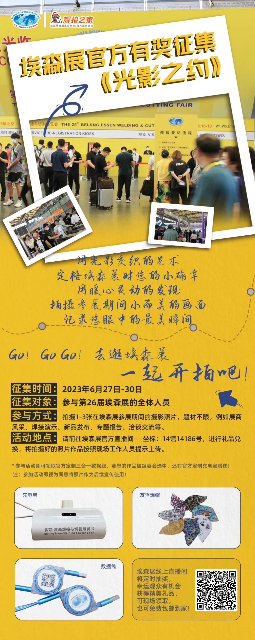 本届北京·埃森焊接展现场还将举办《光影之约》官方有奖征集活动,动动手指拍下精彩瞬间即可参与活动,参与就有纪念品哦~感兴趣的朋友点击图片了解更多详情吧!