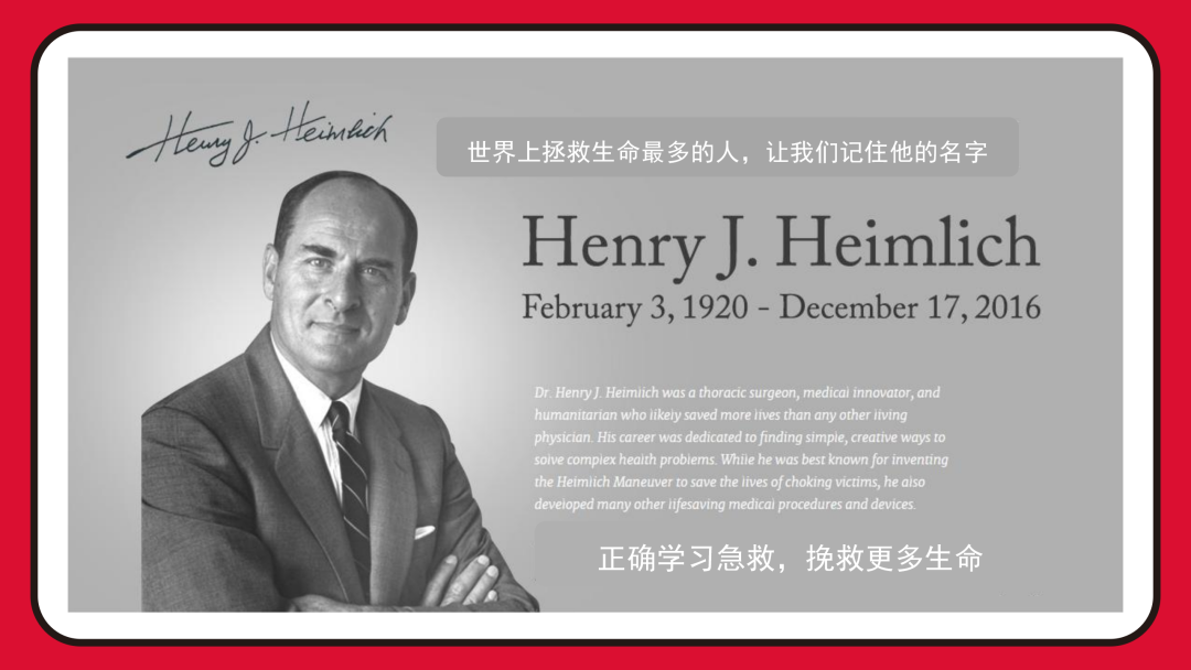“海姆立克急救法”被《世界名人录》称之为:“世界上挽救人性命最多”的急救法。