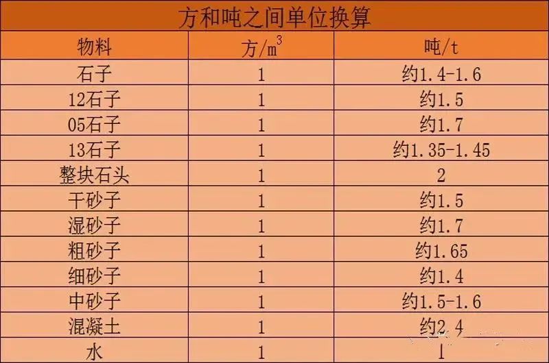 不同物料方与吨之间的具体换算详情可参见下图。