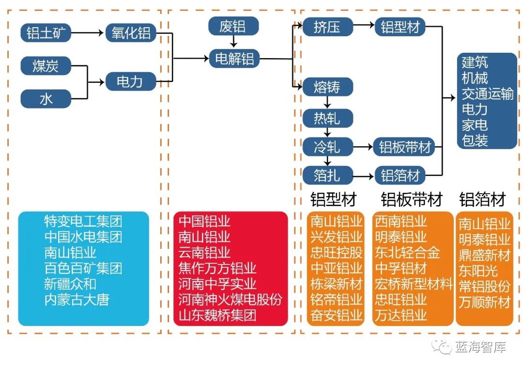 上游氧化铝企业包括特变电工集团、中国水电集团、南山铝业、百色百矿集团、新疆众和、内蒙古大唐国际等;中游电解铝企业包括中国铝业、南山铝业、云南铝业、焦作万方铝业、河南中孚实业、河南神火煤电股份、山东魏桥集团等;下游铝加工企业包括河南神火集团、昆山铝业、华北铝业等。