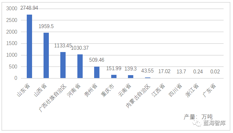 从分省数据来看,2021年氧化铝产量排名前三的分别是山东、山西和广西,氧化铝产量分别为2748.94万吨、1959.50万吨和1133.45万吨,产量合计为5841.89万吨,占全国总产量的75.4%。