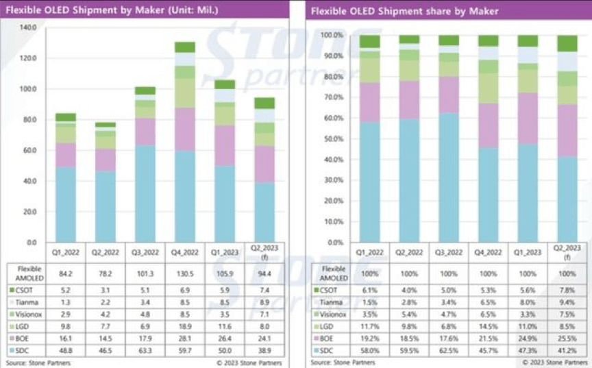 2022-2023年第二季度柔性OLED面板出货量和市场占比