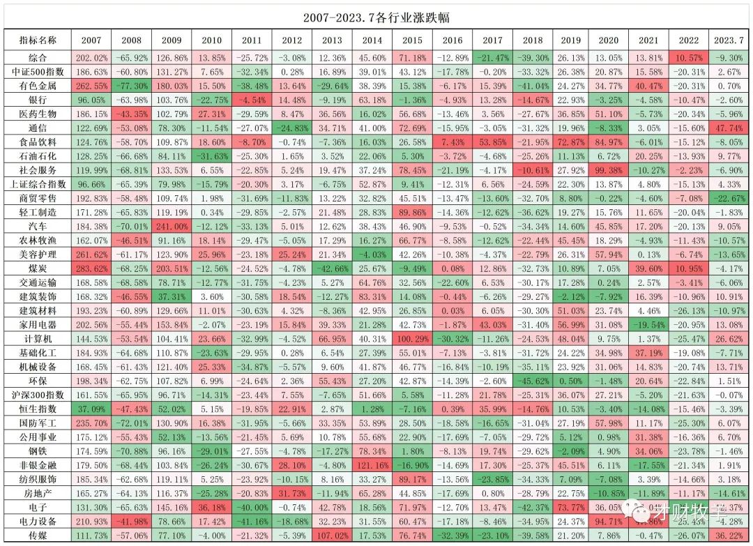 2.大部分行业都是有周期属性,某一年表现最好中间隔几年表现比较差或者一般然后某一年又表现特别好,图标里的表现就是:深红-绿色-深红