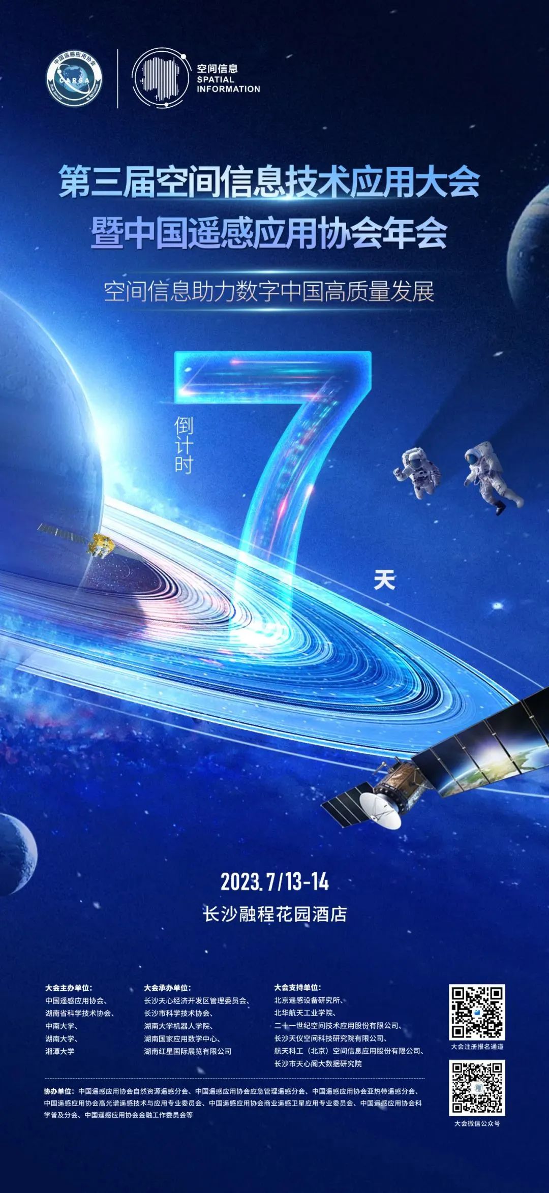 第三届空间信息技术应用大会由中国遥感应用协会、湖南省科学技术协会、中南大学、湖南大学、湘潭大学、长沙市人民政府共同主办,将于2023年7月13日至14日在长沙融程花园酒店召开。大会以“空间信息助力数字中国高质量发展”为主题,主要由开幕式、主论坛、分论坛等活动组成。