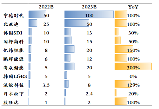 从CR5 内部企业来看,除了宁德时代和比亚迪稳居前两位,其它品牌之间的排名仍在发生变化,以海辰储能为代表的新玩家在技术路线上迭代速度很快,同时产品标称指标优秀,形成差异化竞争,预期放量速度极快。