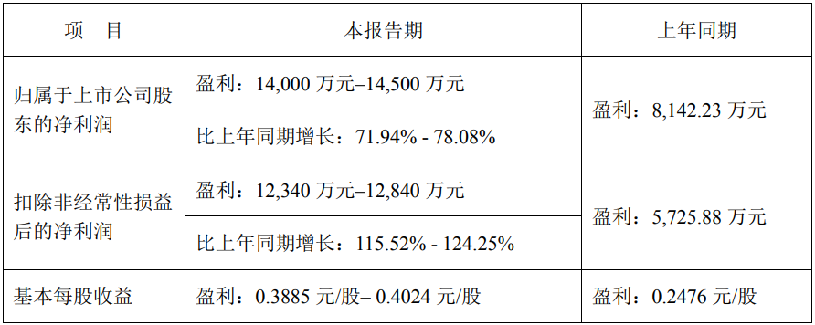 公司实现归母净利润1.40亿元~1.45亿元,同比增长71.94%~78.08%;扣除非经常性损益的净利润为1.23亿元~1.28亿元,同比增长115.52%~124.25%。