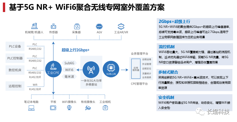 长焜科技打造从核心网、基站、终端的端到端产品系列,提出5G工业互联网厂区覆盖主题方案。通过5G NR+多制式融合的创新技术,实现5Gbps+的下行速率和2Gbps+超级上行能力,特别适合工业物联网数据回传、高可靠性控制、宽带接入等业务场景。通过先进的流控技术和QoS机制,使用户动态选择多条回传通路,既保证了数据可靠性,也提升了用户体验度,实现园区高速率,高可靠的全5G网络覆盖;结合本地UPS或5GC下沉方案,卸载本地用户流量,实现数据不出园区,保护用户隐私。