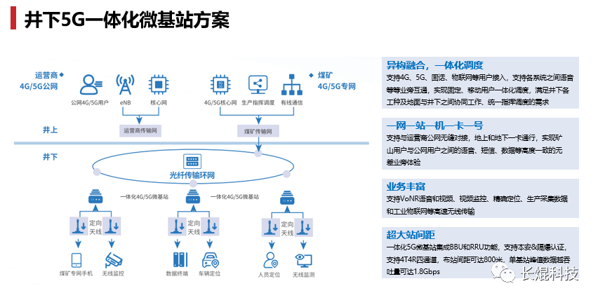 与当前分布式5G基站下井方案对比,长焜科技的5G创新能源方案率先推出低成本、低功耗的一体化5G本安兼隔爆微基站方案,该款基站容量大(单设备吞吐率1.5Gbps,每个模块都具备基带单元,是传统分布式方案的8~16倍),省光纤(系统可直接利旧原有传输,不用拉裸纤接rru);好同步(引入时钟光纤级联模式和Sniffer模式,无须改造1588同步以太网);省成本(设备小巧,功耗低,大大降低煤安认证成本和部署难度);全下沉(核心网可下沉到前端基站芯片内部,实现就近接入和分流,特别适合开采面等场景应用部署)相关系统业界首创,引领煤矿行业5G赋能转型。