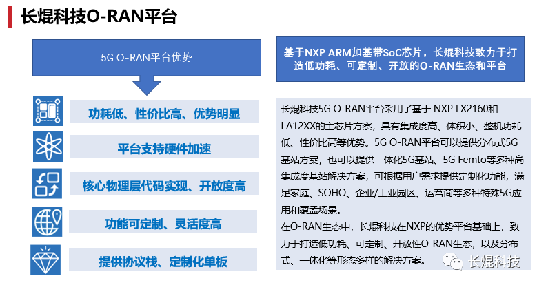 基于NXP ARM加基带SoC芯片,长焜科技致力于打造低功耗、可定制、开放的O-RAN生态和O-RAN平台。该平台具有集成度高、体积小、整机功耗低、性价比高等优势。既适合针对运营商市场构建分布式大、小功率基站,也适合工业场景的高集成度、一体化、大功率、核心网下沉等场景,还可以利用开放的协议栈定制能力,构建更多创新场景和应用,满足公网、企业/工业园区、家庭宽带接入等多种特殊5G应用和覆盖场景。